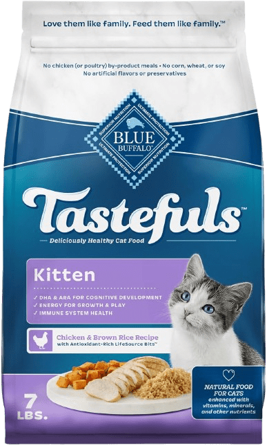 Our kittens love to eat Blue Buffalo Tastefulls kitten kibble, because it has a high protein content, they love the taste, and it keeps their teeth clean!